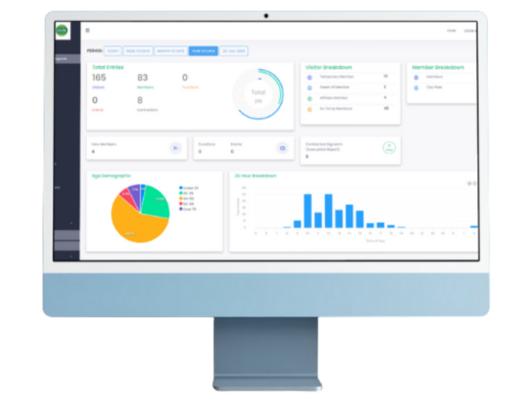 View breakdowns by day/week/month/year, by age demographic, hour, type of visitor, new members, functions, and events.